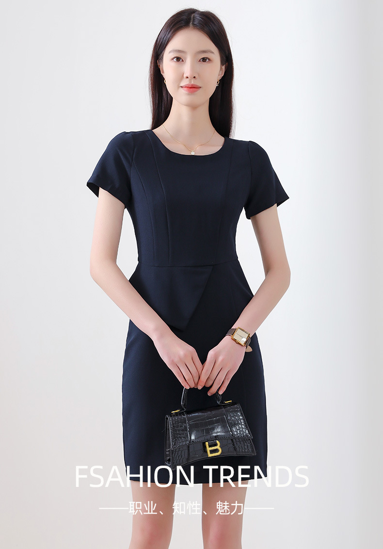 弹力连衣裙夏季女极简风OL通勤职业装短袖显瘦高级感白领商务女装9801lianyiqun,4S店业务导购服装, 房地产业务经理职业装,学校老师正装,公务员正装,可免费发样,按样订购,品质保证! 可来图定制,绣logo,印字都可以! 尺码多,高矮胖瘦都适合